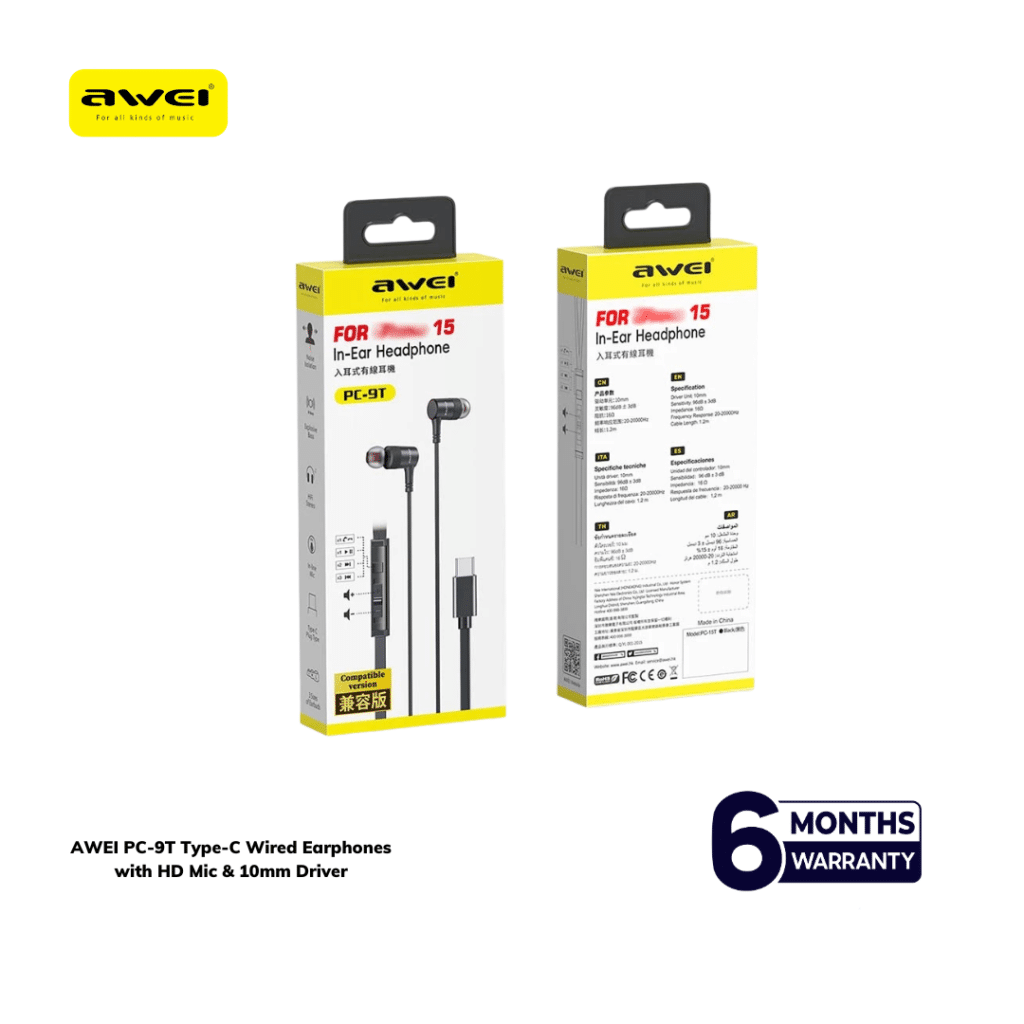 AWEI PC-9T Type-C Wired Earphones with HD Mic & 10mm Driver