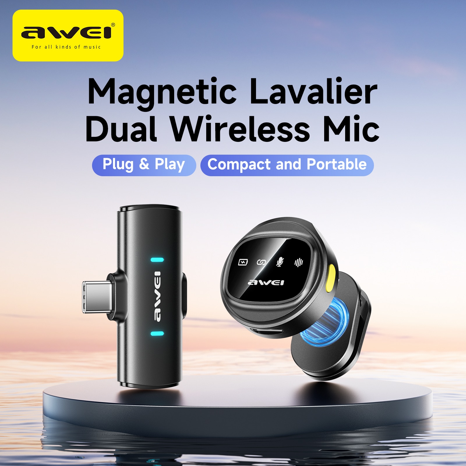 AWEI MK3 Magnetic Lavalier Dual Wireless Microphone System: Plug & Play with 25m Range & 360° Sound Pickup