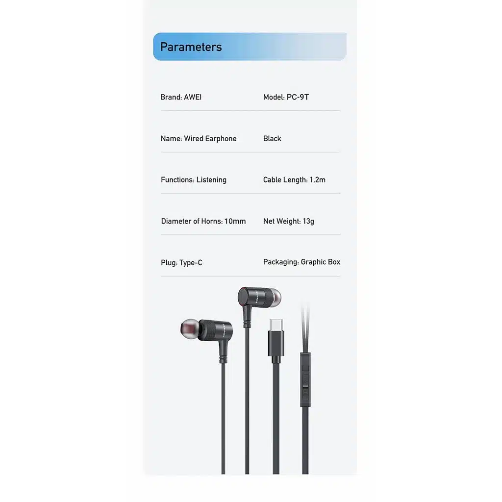 Experience pure, angelic sound with the AWEI PC-9T Type-C Wired Earphones. Designed for those who appreciate the reliability and zero-latency performance of wired audio, these lightweight in-ear headphones deliver stunning sound quality with deep bass and crystal-clear highs. Featuring a hypersensitive HD microphone for smooth communication, an ergonomic semi-in-ear design crafted from over 10,000 fit tests, and a convenient Type-C plug, they’re the perfect companion for music, gaming, calls, and daily listening. Top Tech Zone guarantees 100% authentic products backed by an official warranty.